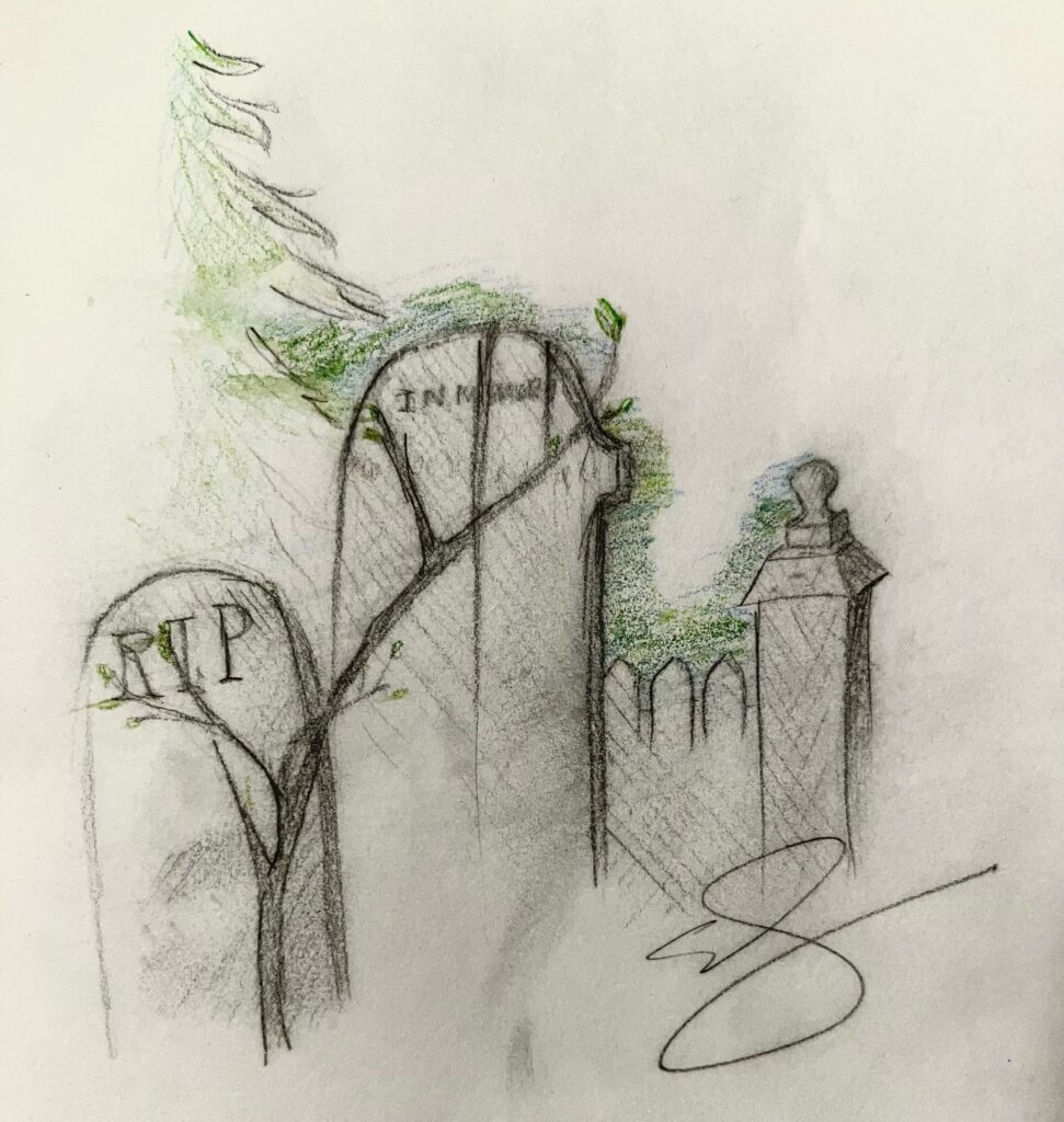 This activity allowed us to reflect while we created artworks, as well as discussing the different techniques each of us connected with, or even the stories we read (informational sign at the entrance of the cemetery).