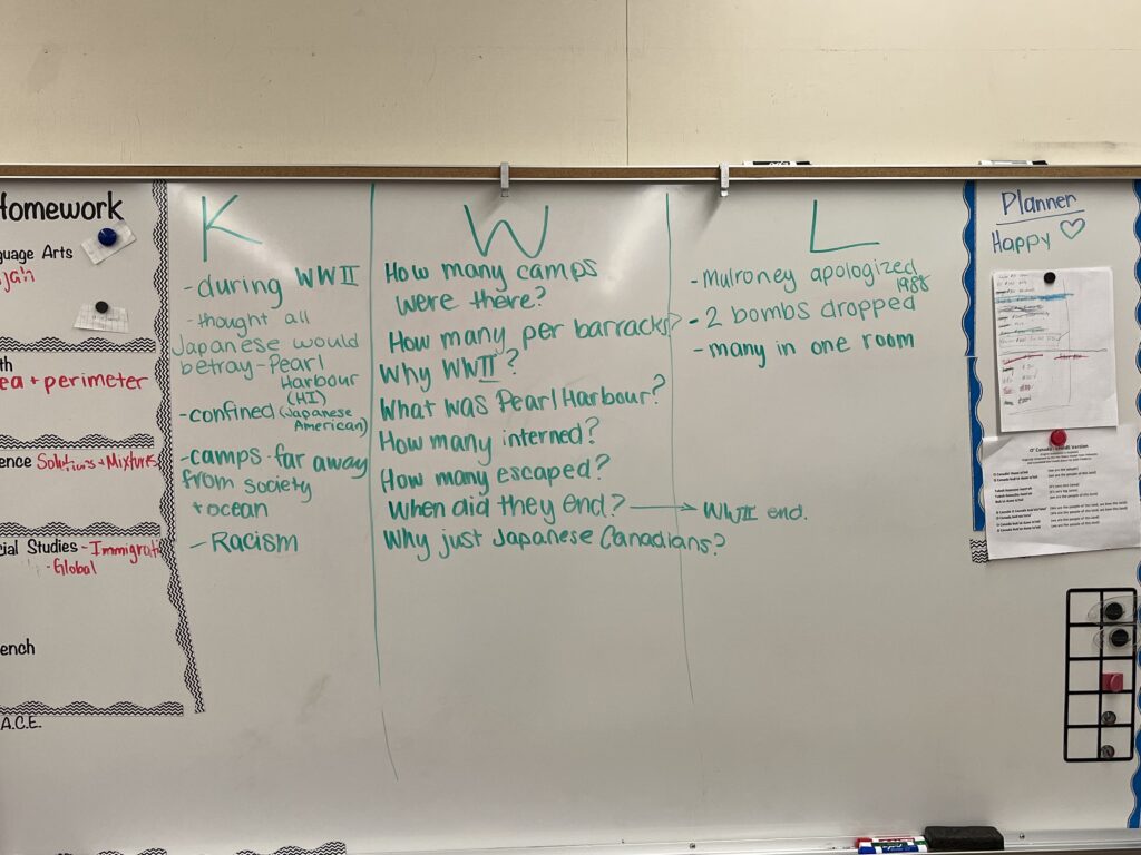 I began teaching the subject of Japanese Internment Camps by creating a KWL chart – this time on the whiteboard.