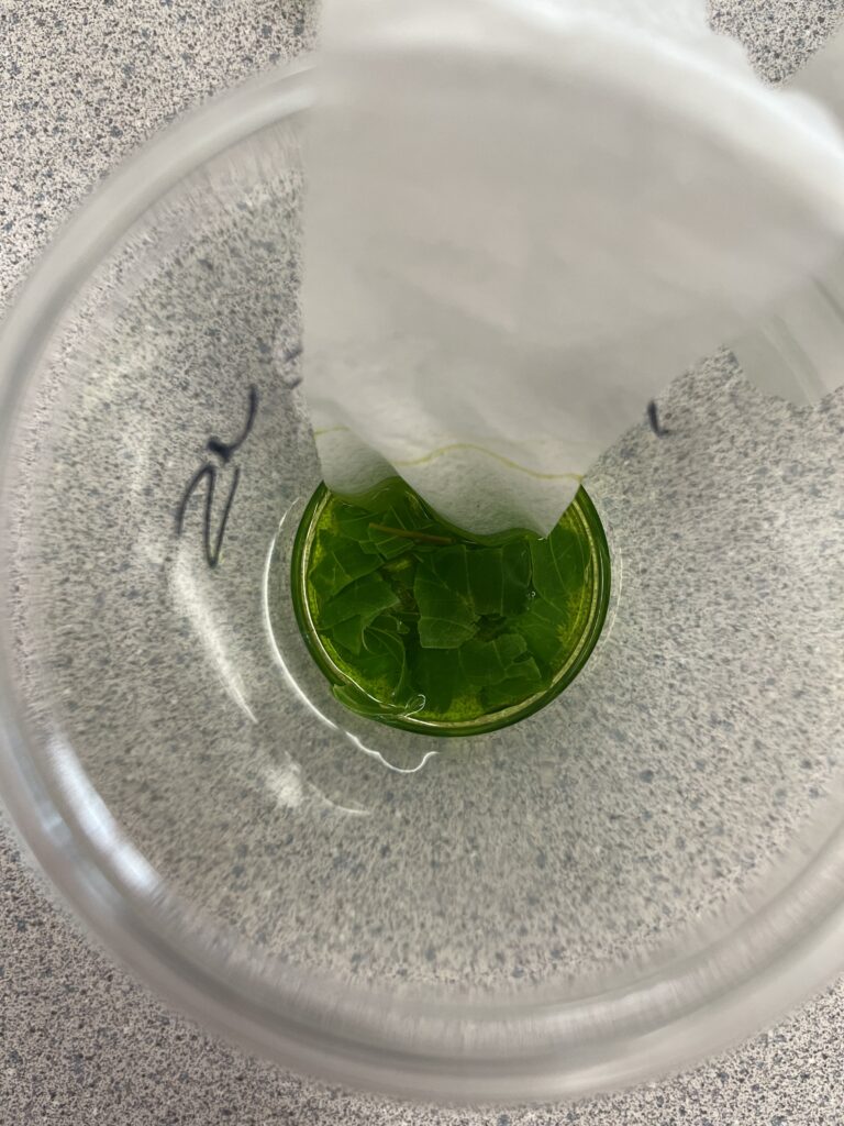 Once every student had collected their leaves, we returned inside, ripped or cut up our leaves and placed them into plastic cups (reusing them from the evaporation experiment), students then signalled that they were ready and grabbed a coffee filter strip. I poured 70% rubbing (isopropyl) alcohol on top of the leaves so that they were covered, students then stirred so that the green pigments from the leaves dyed the alcohol.