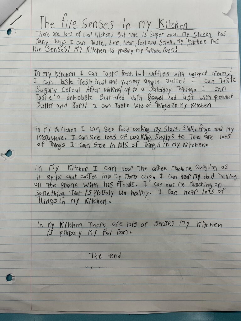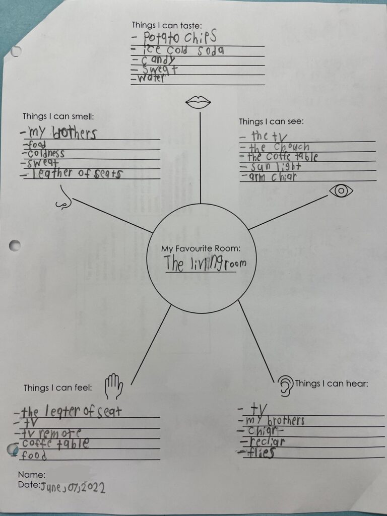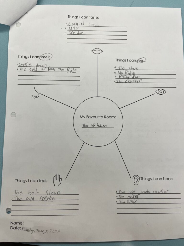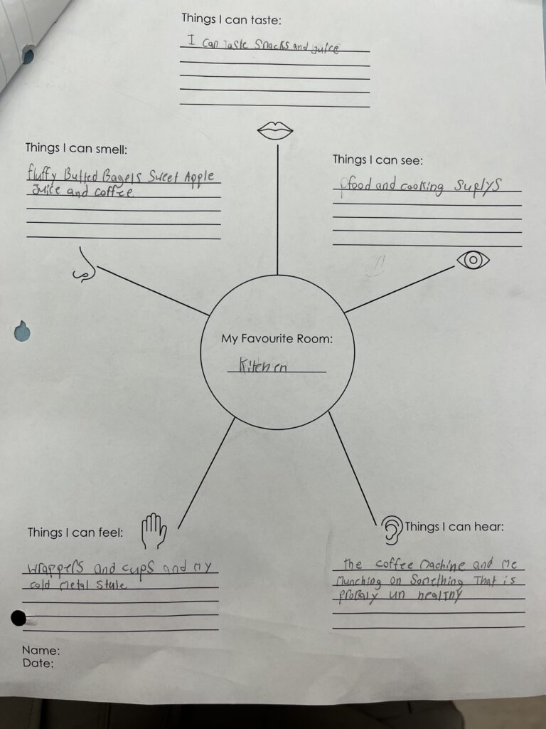 To plan – students were given a resource to lay out their thoughts through their senses. They chose their favourite room and then we discussed different things we could see, hear, feel, smell, and taste. I modelled using the document camera with my own example of my kitchen being my favourite room in the house.