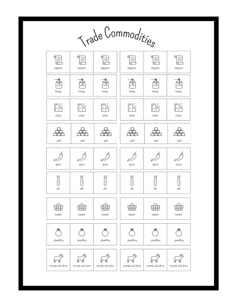Egypt: Papyrus and Gold, China: Silk and Spice, Maya: Honey and Cacao, Mesopotamia: baskets and jewelry, AND India: animals and spices