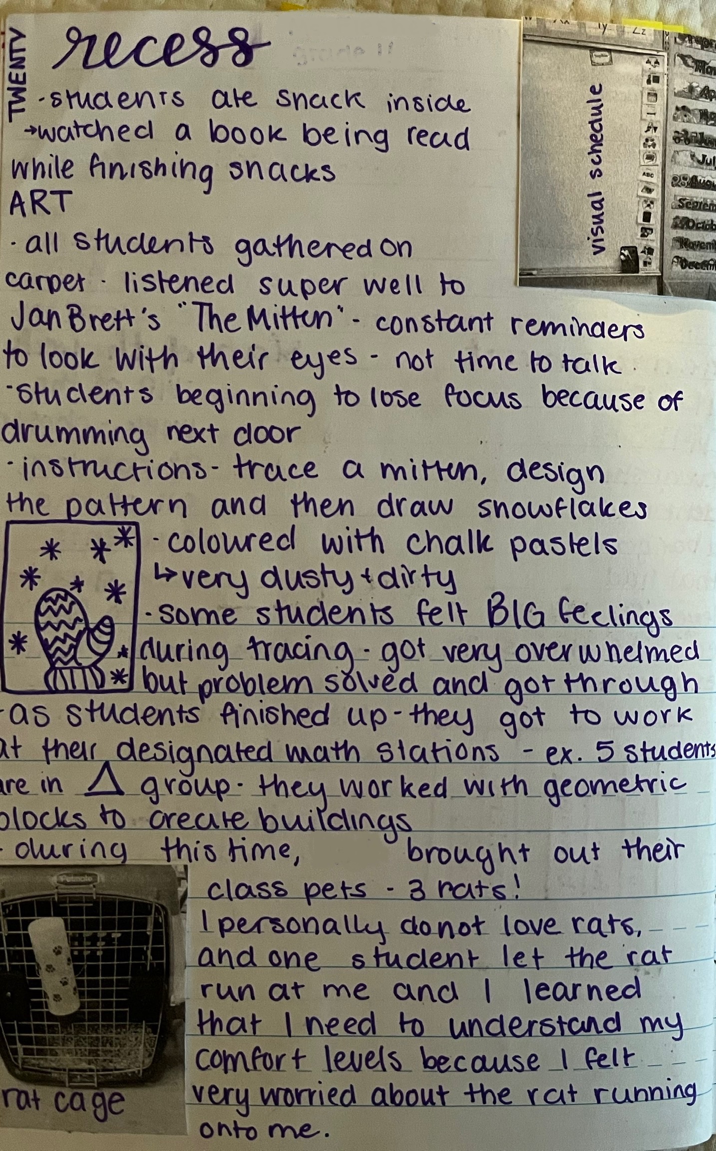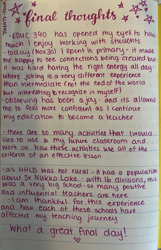 As Hart Highlands was my final observation school, I learned the importance of reflection, looking at how things were done in other schools compared to Hart Highlands, or even how I changed through the semester. I am thankful for the different experiences in each school, I am excited to learn more and more.