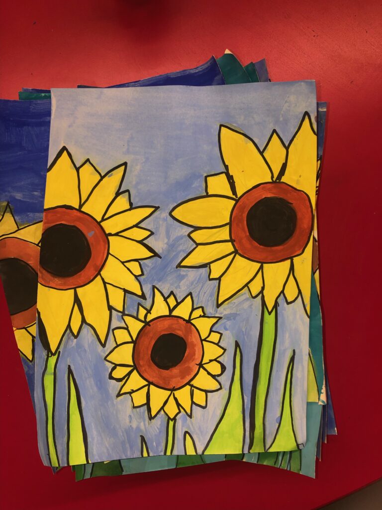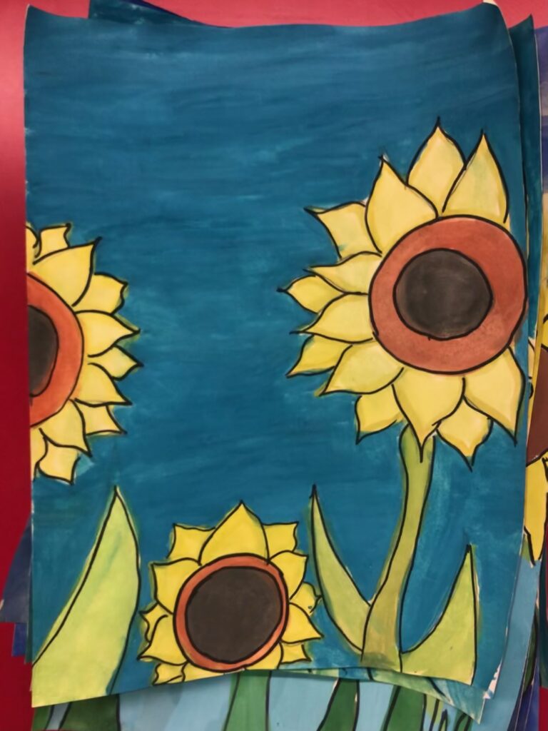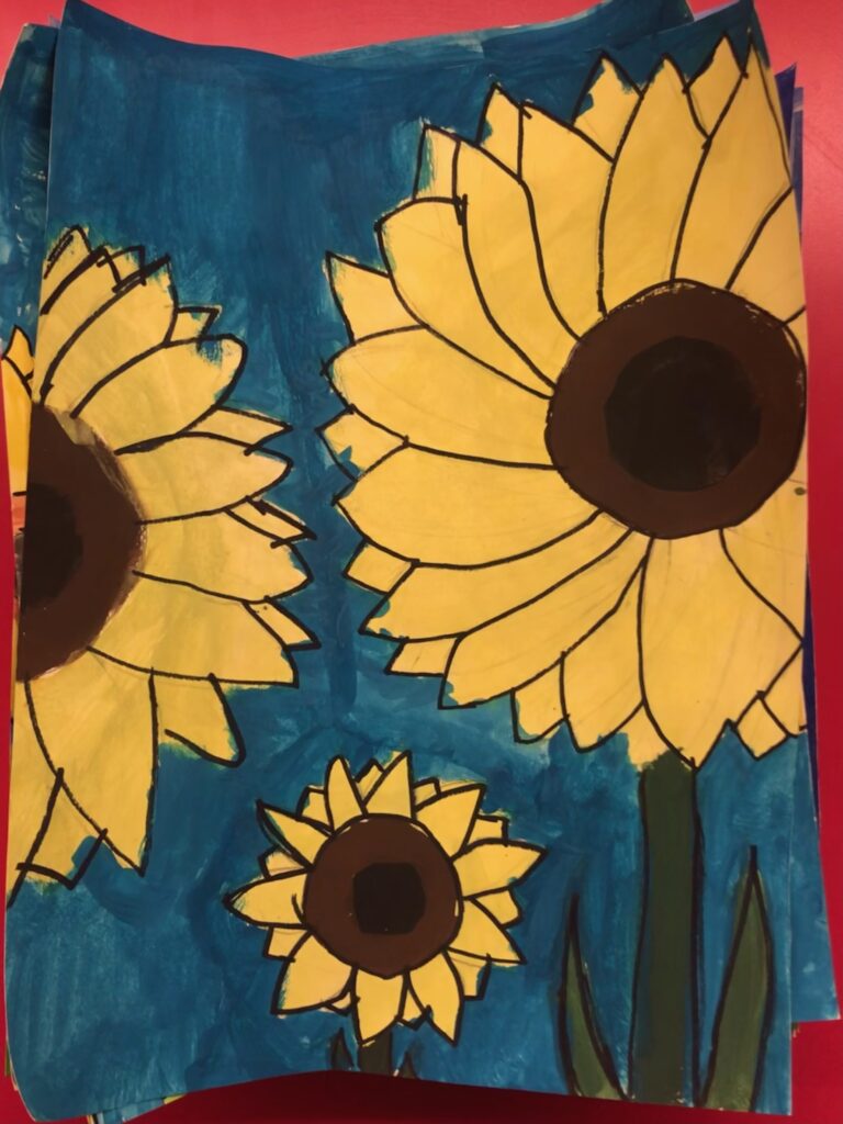 Two students worked together to paint my example sunflowers for one of their classmates out of the room – heartwarming.